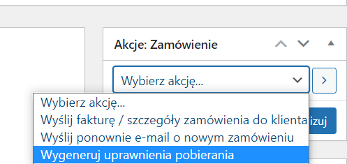 - Wygeneruj uprawnienia pobierania – jeśli zamówienie złożone jest na produkt wirtualny możemy wygenerować uprawnienia do pobierania przy pomocy tej akcji.