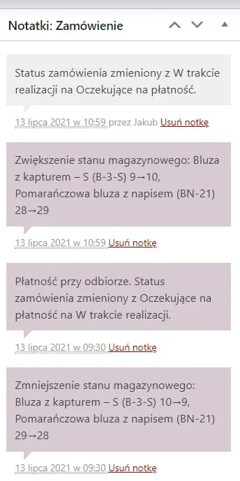 Jeśli dokonamy jakichkolwiek zmian związanych ze statusem, stanem magazynowym itp. wyświetli nam się automatycznie informacja w panelu Notatki znajdującym się po prawej stronie szczegółów zamówienia.